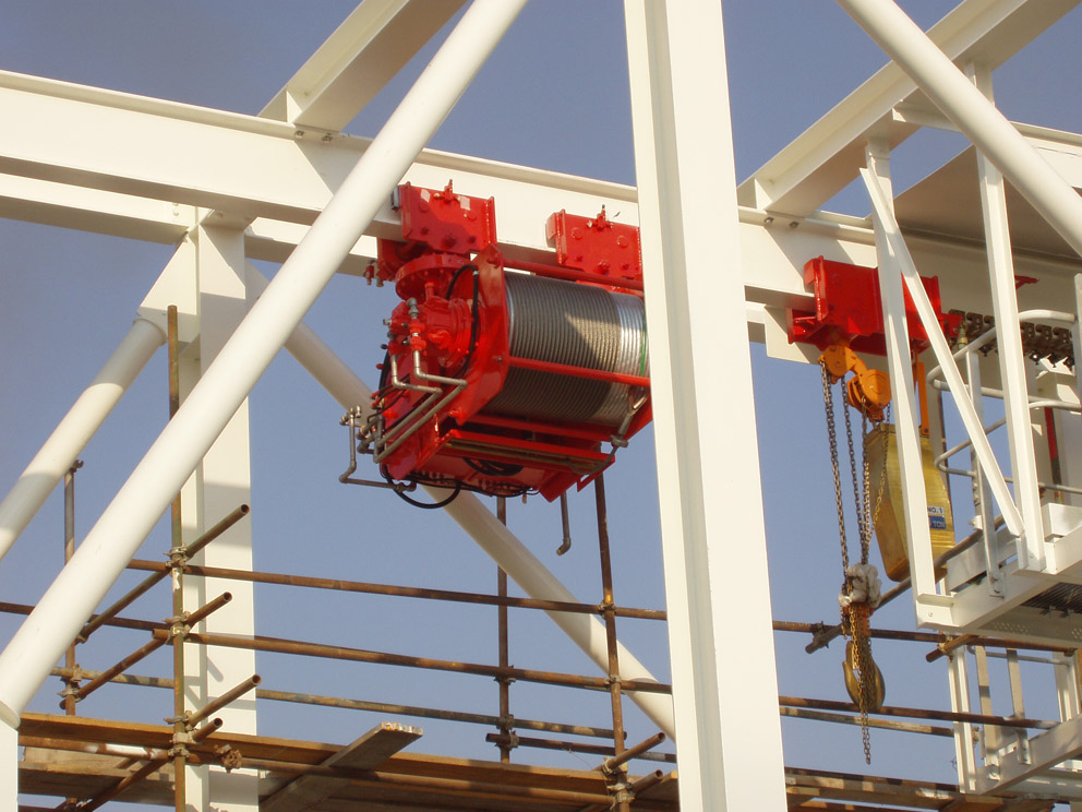 特征:这里使用的起吊葫芦里并列配置了2台气动马达和2台滚筒,因为1台泵用2根绳索来同步卷上卷下,因此有极高的安全性,即使有1根绳索断裂,也不会导致泵落下。