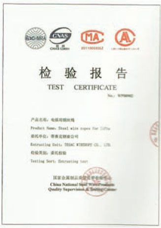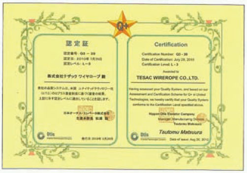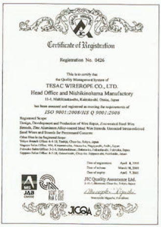 TESAC已获得ISO9001质量体系认证,日本海事协会事业所认证,煤矿用产品安全标志认证,专利·商标 1 STAR ROPE(专利) 2 SUN ROPE(专利) 3 POSTHOME ROPE(专利) 4 ROPE PRINTER (专利) 5 EYE CLAMP(专利)(商标) 6 EYE ROCK(商标) 7 SG CRAMP(Swaged Socket)(专利) 8 Omega Filler Rope(商标) 9 Splice Braid (商标)。