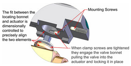 阀杆密封寿命长的一个关键因素是尽量减少因阀门的执行器失准而导致阀杆侧面装载负荷。Gemini独特阀门的执行器耦合系统,采用精确加工定位阀盖和配套的驱动器压盖,以确保近乎完美的校准。两个相交的夹紧螺钉是用来完成安装程序的,把阀门拉入执行器,并牢固地锁定到位。这些夹紧螺钉是很容易进入安装的。