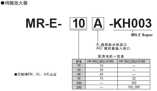 三菱伺服放大器MR-E型号表示及对应伺服电机
